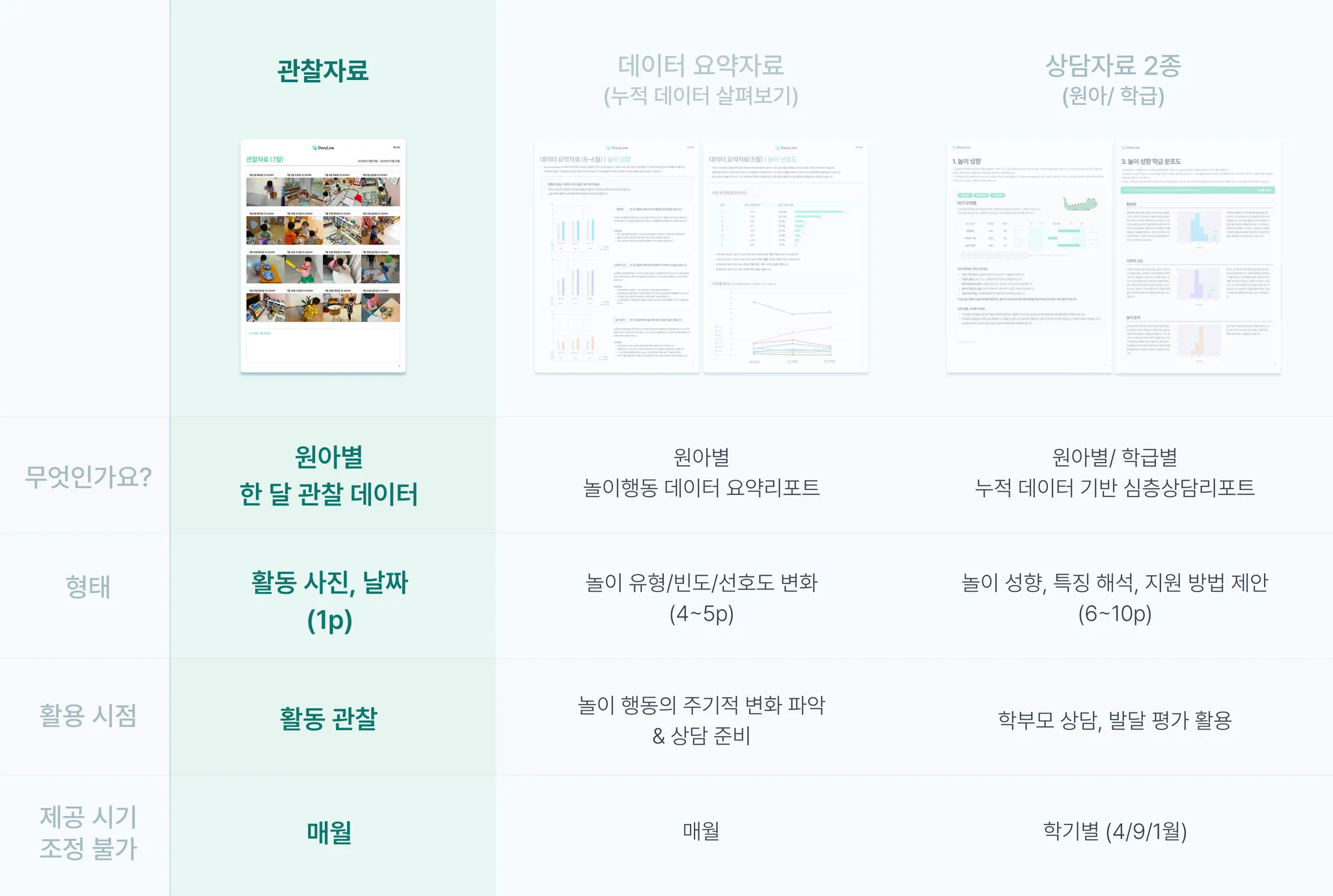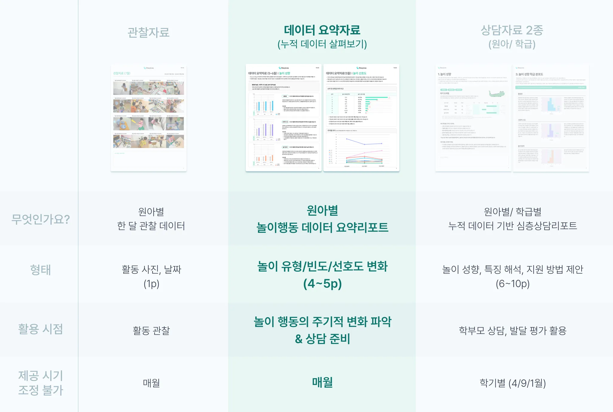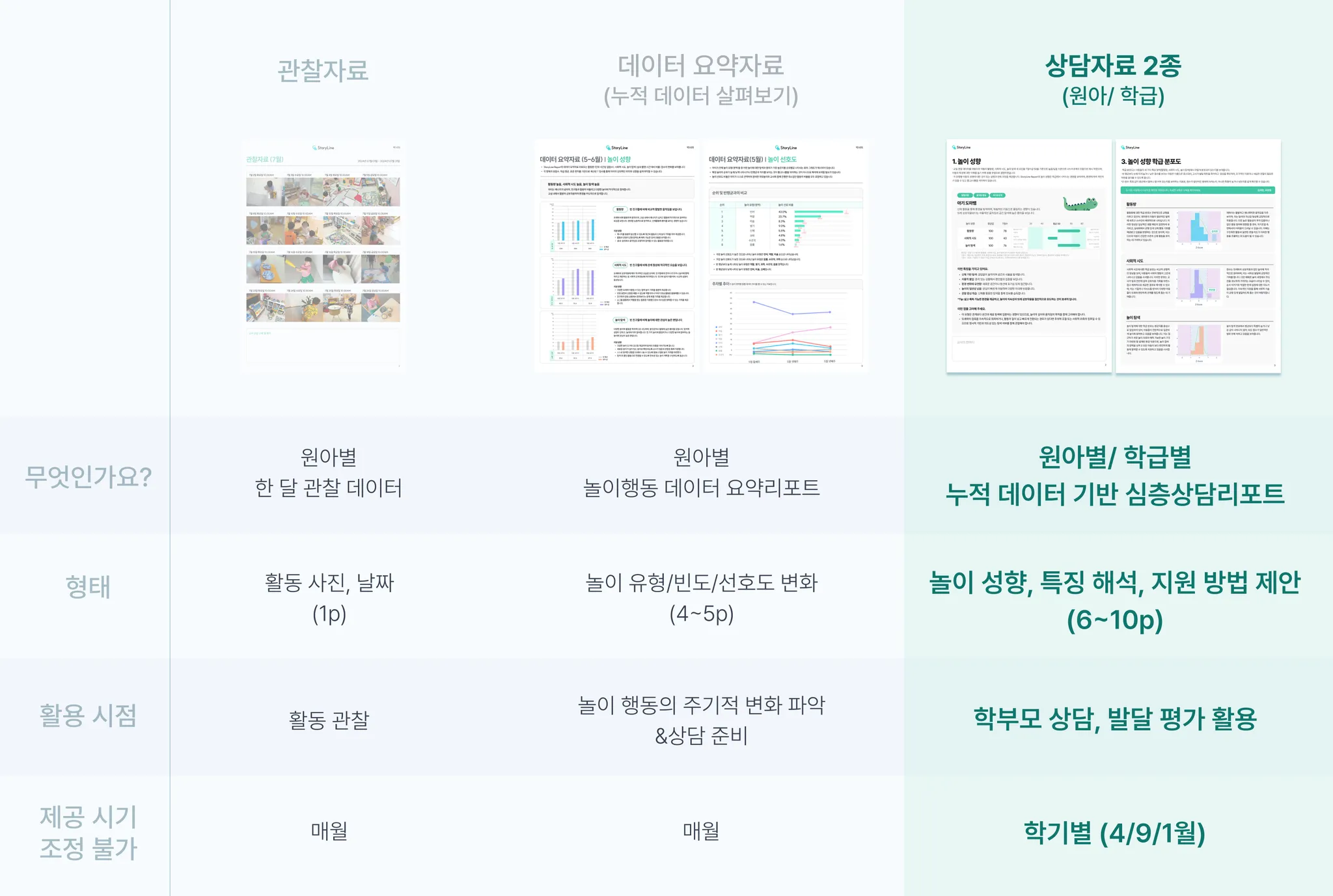 는 학기별 상담 시즌에 맞춰 제공되는 심층 리포트로, 누적 데이터를 기반으로 아동의 발달 특성과 놀이 성향을 분석하고 지원 방향을 제시합니다.
